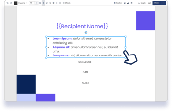 Rich Text allows you to format text directly within the certificate designer, giving you more flexibility and control over how content appears. You can combine different text sizes, fonts, and styles in a single text field, add structured elements like bullet points, and create curved text for decorative or formal layouts—helping you design professional, visually appealing certificates with ease.