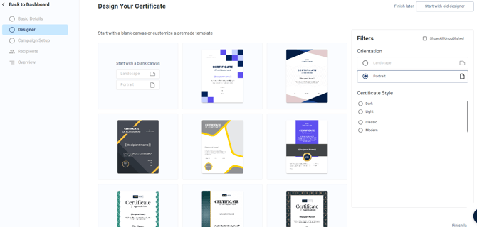 2. Select Your Design: In the certificate settings, click on the "Designer" tab. You can choose either a blank canvas or one of the available templates.
