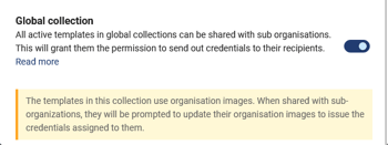 The Global Collection feature in Organisation Hub allows parent organisations to share collections with sub-accounts and authorised issuers. At the credential level, the parent organisation can define which templates within a collection are available to each sub-organisation.