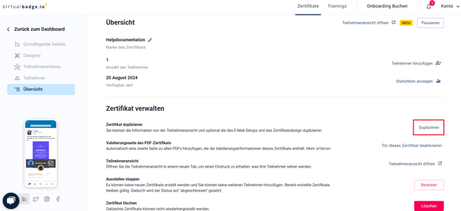 2. Gehen Sie auf die Registerkarte "Übersicht" Ihres Zertifikats und klicken Sie auf "Duplizieren".