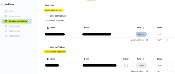 Sobald der Trainer akzeptiert hat, können sein Name, seine E-Mail und sein Status unter "Liste der Trainer" eingesehen werden.