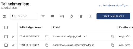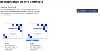 Um zu vermeiden, dass dieselbe E-Mail-Adresse mehrere einzelne Zugriffs-E-Mails erhält, unterstützt Virtualbadge sogenannte Mehrere Zertifikate.