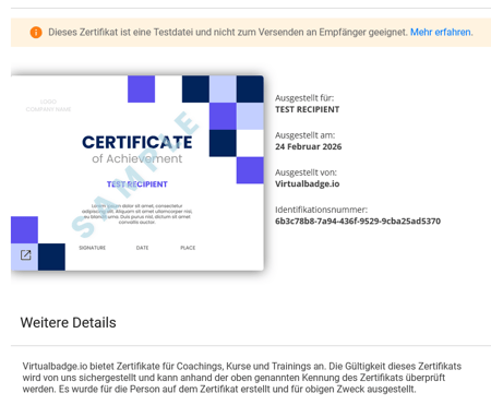 Wenn Sie im Rahmen solcher Tests ein Test-Credential erhalten haben, wird es mit einem sichtbaren „Sample“-Text bzw. einem gelben Hinweis angezeigt, um klarzustellen, dass es sich nicht um ein echtes Zertifikat für den produktiven Gebrauch handelt.