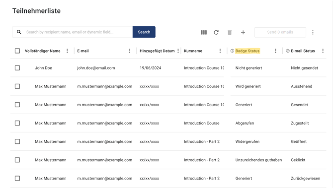 Der Status eines Zertifikats oder Badges gibt wertvolle Einblicke in den Erstellungs- und Zustellungsprozess. Dieser Status ist eng mit dem E-Mail-Status verknüpft, da beide voneinander abhängig sind. Nachfolgend finden Sie eine Übersicht der verschiedenen Status, die Sie antreffen können.