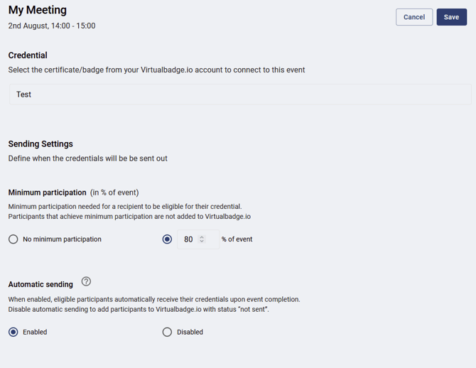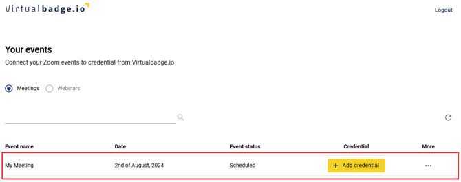 - Klicken Sie auf „ Zertifikat hinzufügen“, um Ihr Meeting/Webinar mit einem Virtualbadge.io-Zertifikat oder -Badge zu verbinden